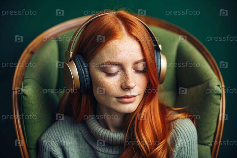 Молодая красивая рыжеволосая женщина с веснушками слушает музыку в больших беспроводных наушниках дома на стуле в гостиной