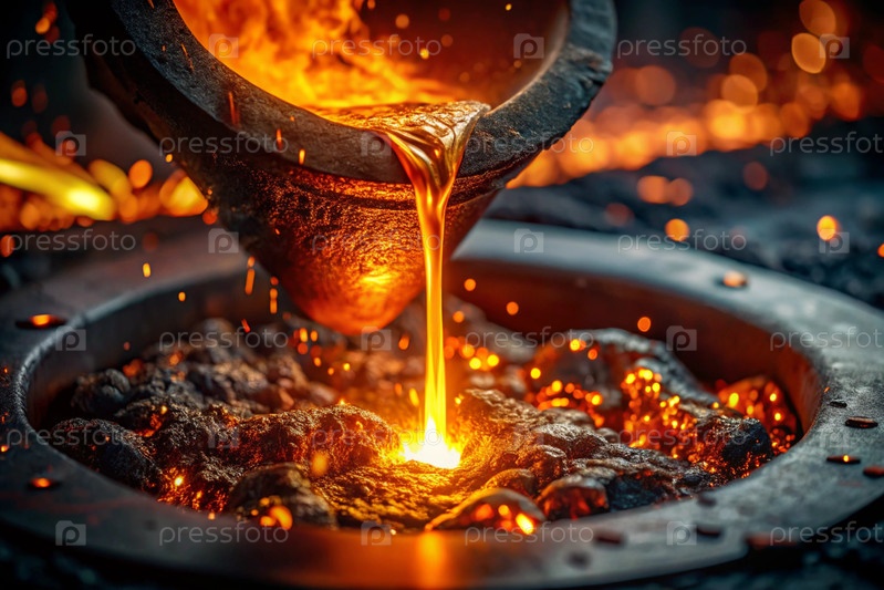 Тяжёлый труд. Фабрика, промышленность, металлургия. Отливка жидкой стали из ведра во время процесса литья в литейной фабрике. Производство металла