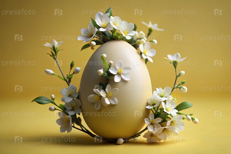 Концепция яркого пасхального праздника минималистична. Пасхальное желтое яйцо с нежными белыми вишневыми цветами на тонком жёлтом фоне