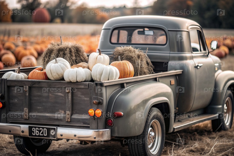 Осень, осенний дизайн.Большой урожай тыквы на заднем сиденье ретро-пикапа, крупный план
