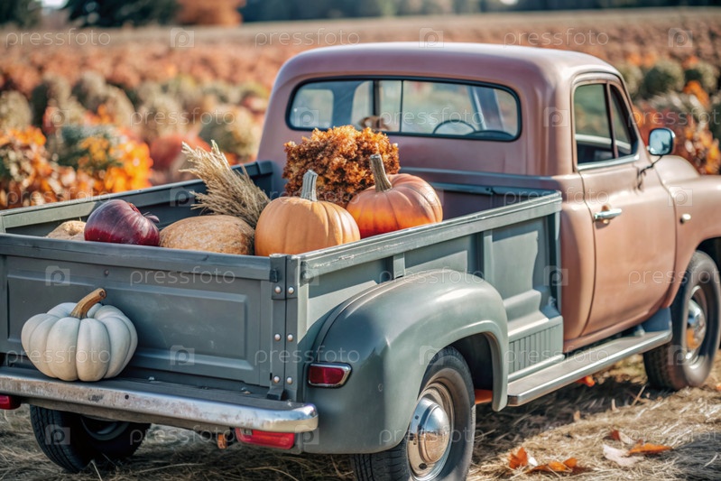 Осень, осенний дизайн.Большой урожай тыквы на заднем сиденье ретро-пикапа, крупный план