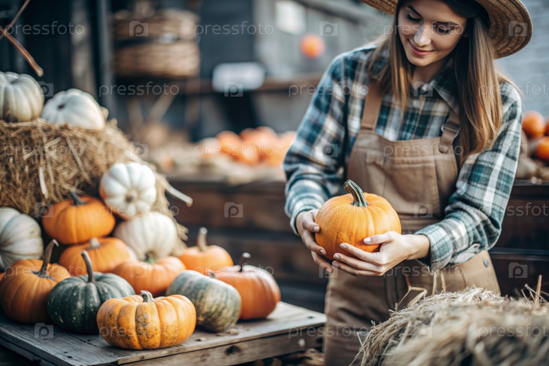 Руки женщины в квадратной рубашке с тыквенным крупным планом и красивым осенним рисунком. Сбор тыков. Концепция празднования Дня благодарения и Хэллоуина