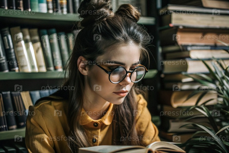 Чтение, подготовка к экзаменам. Прием в колледж. Молодая девушка с очками среди многих книг во внутренней части гостиной, сидящая дома под естественным светом