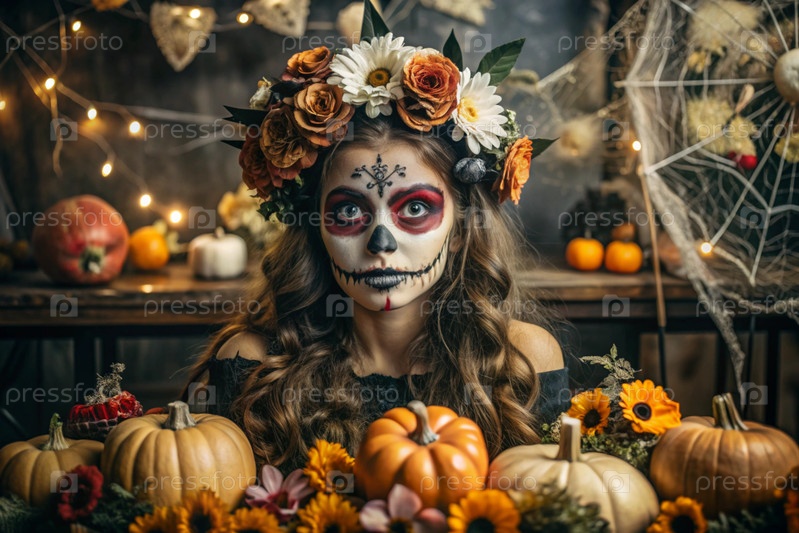 Концепция Хэллоуина. Ужасно. Костюмированная вечеринка. Красивая женщина с покрашенным черепом на лице и цветами на голове. Баннер, открытка