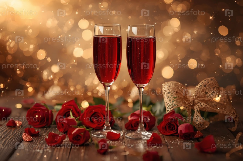 Концепция Дня Святого Валентина: два бокала красного вина, шоколад в окружении красных цветов и сердца на День святого Валентина