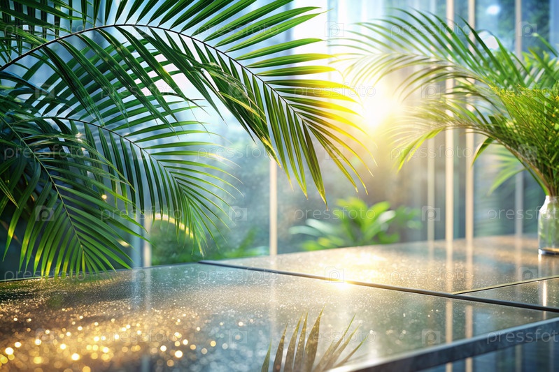 Минимальный фон для демонстрации продукта.Современная стеклянная трибуна со стеной из стекла и пальмовых листьев.Элегантный дизайн для презентации продукции