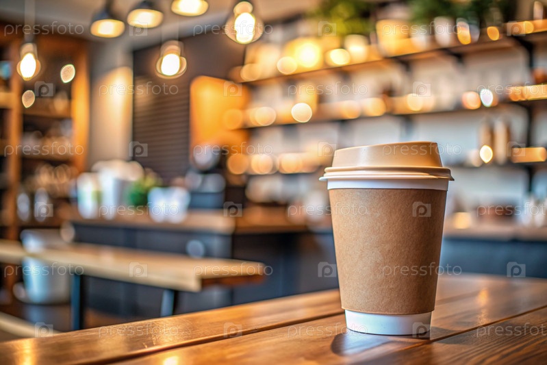 Экологически чистый бумажный стакан для одноразового использования с кофе на столе против размытого фона кофейни