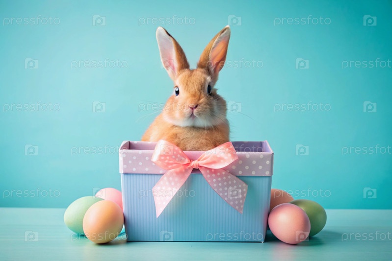Известный праздник. милый пасхальный кролик заглядывает из коробки с подарками и разноцветные яйца разбросаны вокруг. концепция счастливой Пасхи
