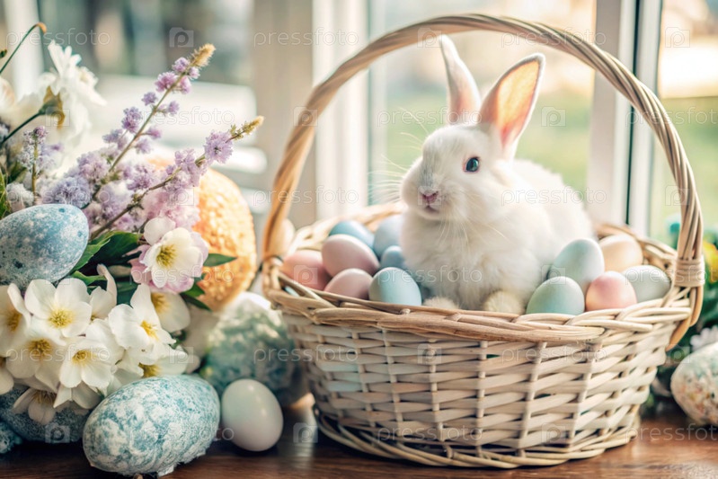 Баннер. пасхальный кролик в плетеновой корзине, наполненной красочными пасхальными яйцами. концепция весенних праздников Пасхи