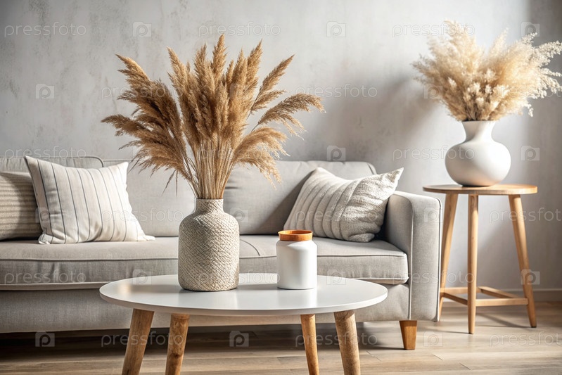 Современная белая керамическая ваза с сухой травой на деревянном столе Скандинавский интерьер Пустая белая стена со тенью из окна