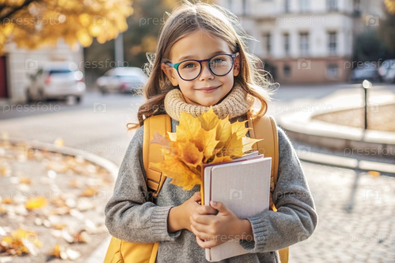 Красивая девушка с очками и букетом осенних цветов впервые идет в школу. Ребенок со школьной сумкой, книгой и цветами. Малыш на городской улице