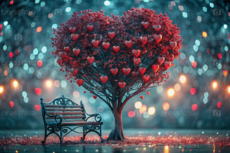 Красивое фантастическое дерево в форме сердца, сияющее среди деревьев парка и скамейка для влюбленных на сказочном фоне боке-стиля