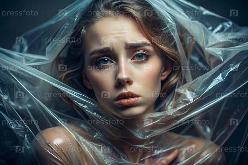 Девочка завернута в целлофан или сумку. Девушка задыхается. Пластиковое загрязнение планеты. Опасность для окружающей среды. Сокращение повторного использования пластика. Переработка. Концепция мусора
