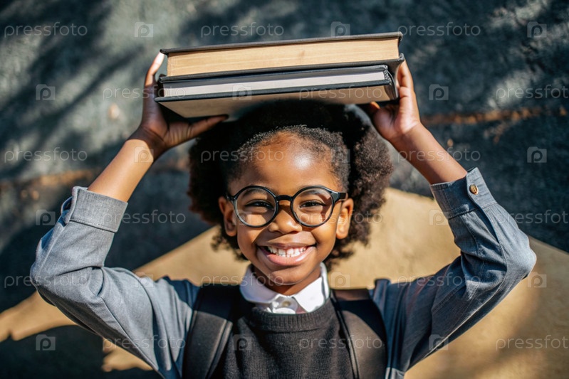 Красивая афроамериканская девушка с очками и книгами.Ребенок впервые ходит в школу.Ребёнок на свежем воздухе.Возвращение к школе