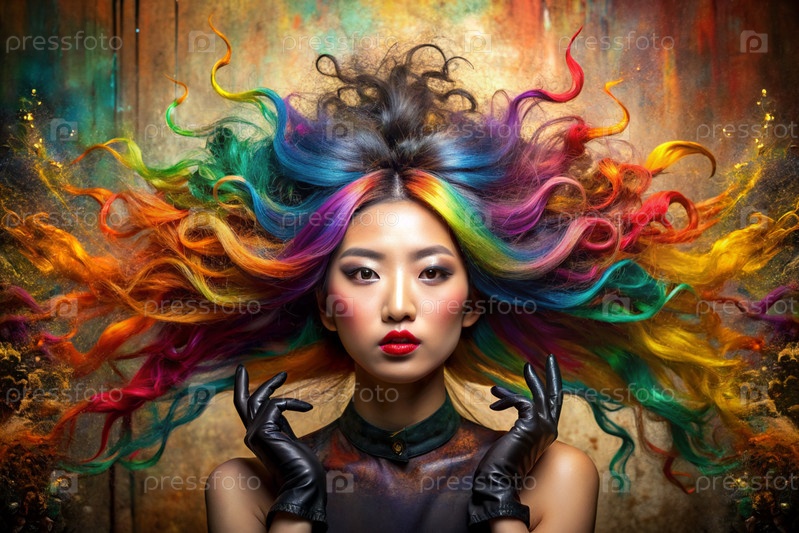 Творческий баннер для салона красоты или парикмахера. Модное профессиональное окрашивание волос. Красивая азиатская женщина с длинными многоцветными волосами. Взрыв цветов на голове
