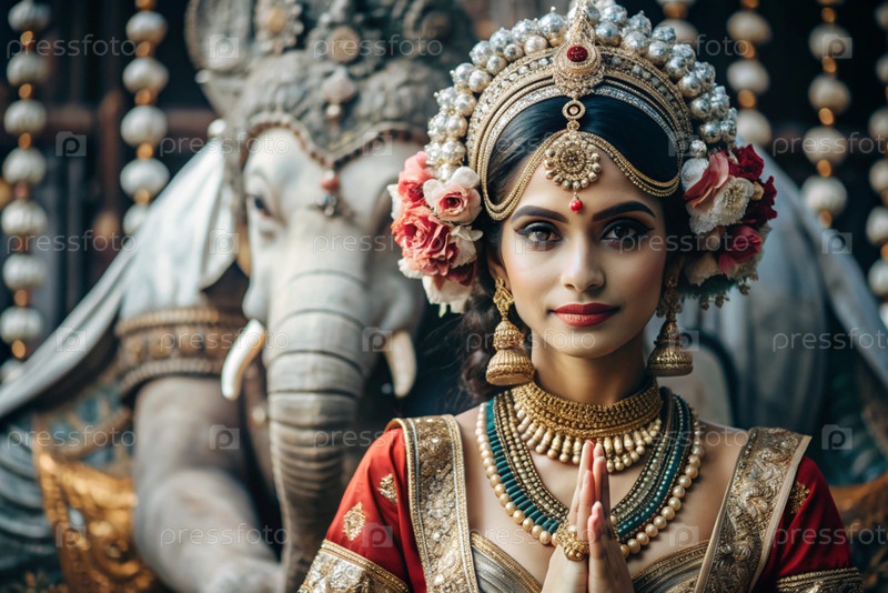 Красивая индийская девушка в традиционном национальном костюме, сари. со слонами. портрет символизирует традиции, культуру и красоту народа Индии