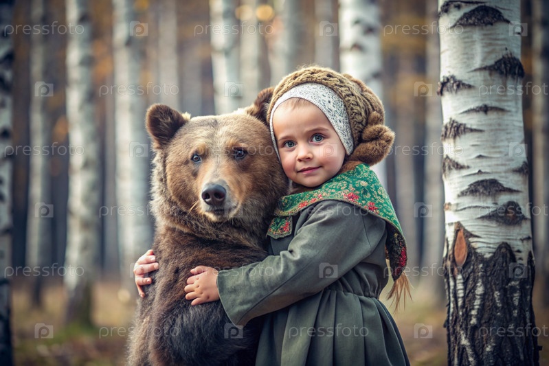 Красивая маленькая девочка в русской народной одежде и с платками на голове в березовой роще с живым медведем Русский фольклор, славянская мифология