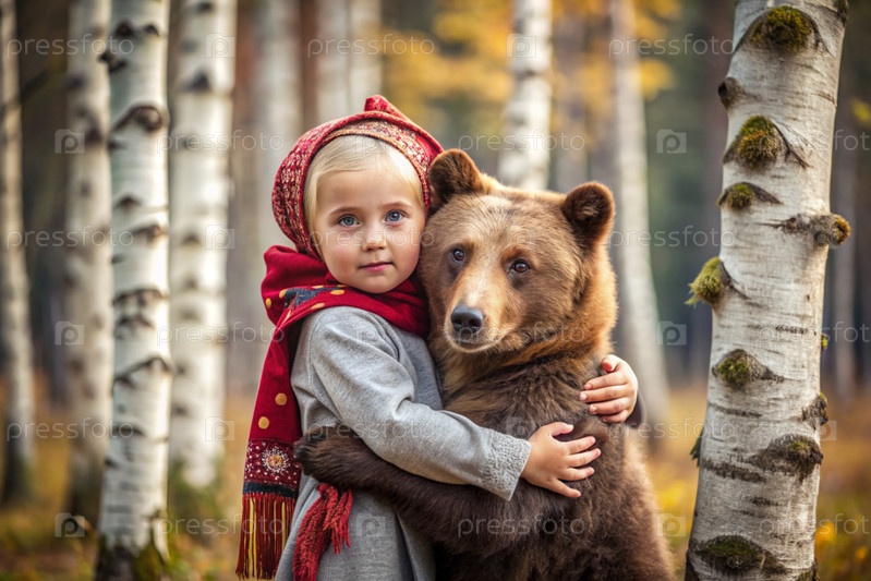 Красивая маленькая девочка в русской народной одежде и с платками на голове в березовой роще с живым медведем Русский фольклор, славянская мифология