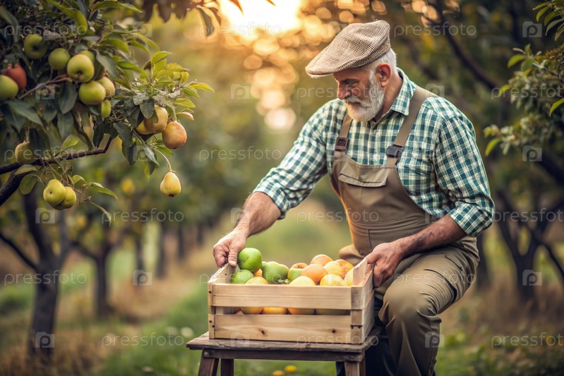 Сельскохозяйственная промышленность. Деревянный ящик с грушами в руках фермера-мужчины. Садовник собирает богатый урожай. Ближе, солнечный свет. Осенний сбор фруктов и овощей