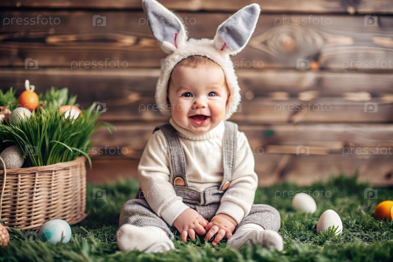 Баннер. Винтажная открытка. Мальчик в костюме пасхального кролика с милыми ушами. Концепция праздника Bright Easter Spring