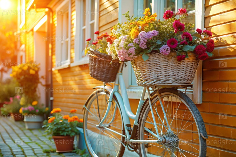 Красивый ретро-велосипед с цветами в корзине стоит за пределами летнего дома.Лето наступило.Городской транспорт