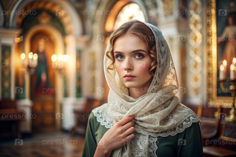 Портрет красивой молодой женщины с платками в православной церкви.Девушка молится в церкви среди икон