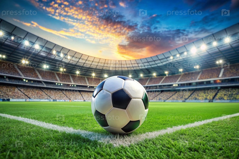 Футбольный мяч на зеленом поле футбольного стадиона, готовый играть в центре поля