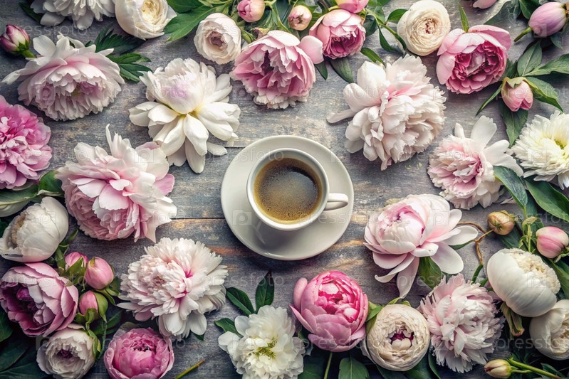 открытка. чашка кофе с тарелкой и белые розовые пионы. красивая натюрмортная картина. весна, лето. приятное утро концепция