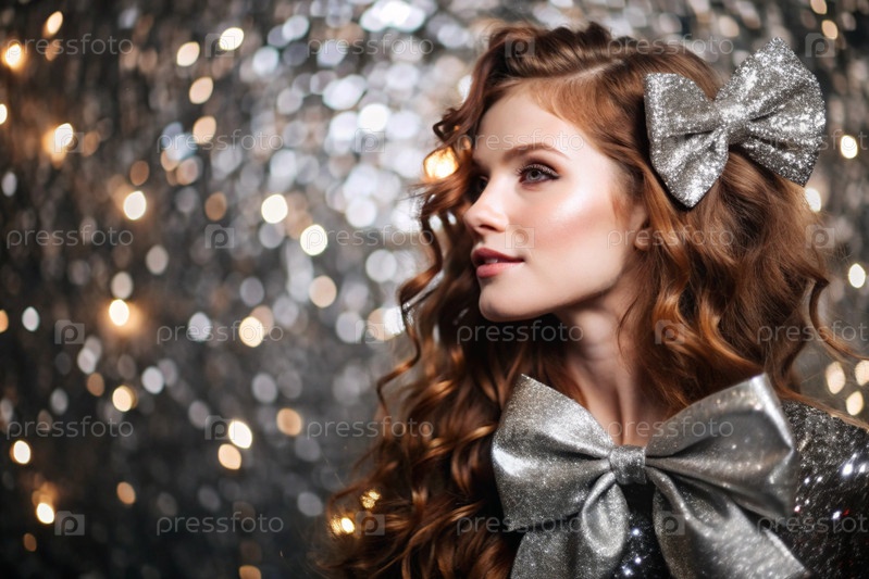 Портрет красивой рыжеволосой девушки с большим луком на голове.Концепция новогодних праздников, костюмированная вечеринка и подарки