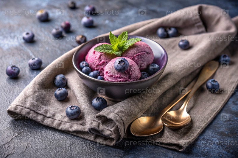 сладкий десерт. любовь к мороженому. шар мороженого и свежие черники. баннер, реклама