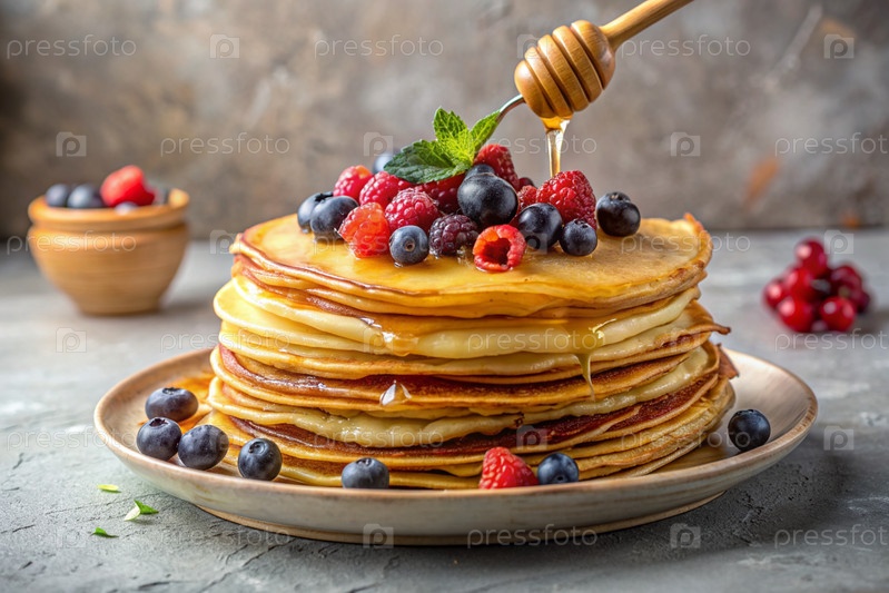 Вкусные блины с медом, ягодами, чернилами, клюквами и малиной.Концепция российского праздника Масленица