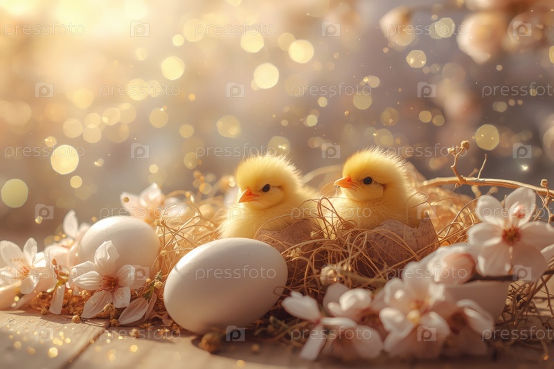 Концепция яркого Пасхального праздника. Нежные розовые пасхальные яйца, желтые курицы и вишневые ветви на деревянном фоне. Концепция ярких пасхальных праздников в 2026 году
