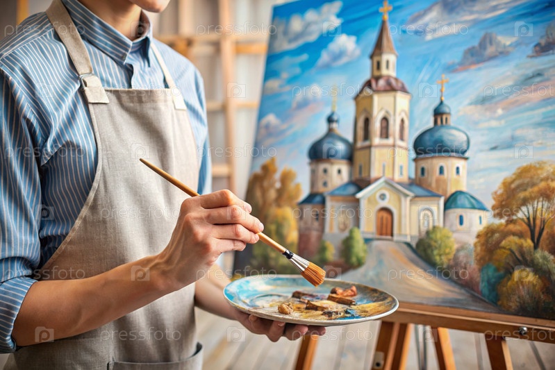 Художник рисует картину с масляными красками на холсте.На картинке изображена православная церковь, храм.Религия, творчество и отдых