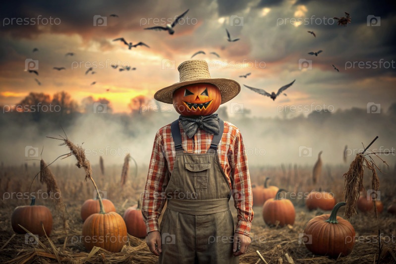 Концепция Хэллоуина. Ужасная. Страх. Устрашающий богий с тыквенной головой, квадратной рубашкой и бабочкой. Баннер, открытка