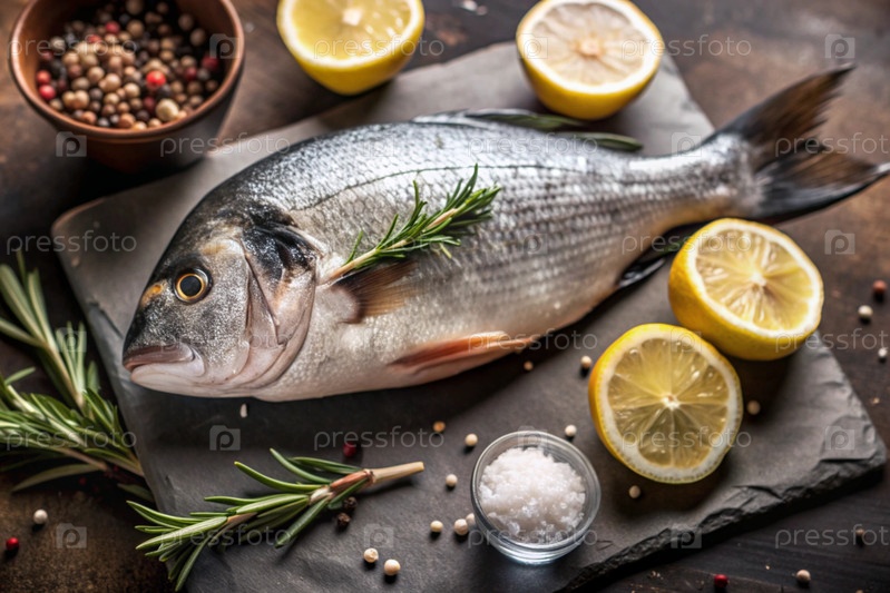 Вкусная и здоровая рыба. сырой дорадо с лимоном и ингредиентами на темном фоне. баннер, меню, место для текста рецепта, верхний вид