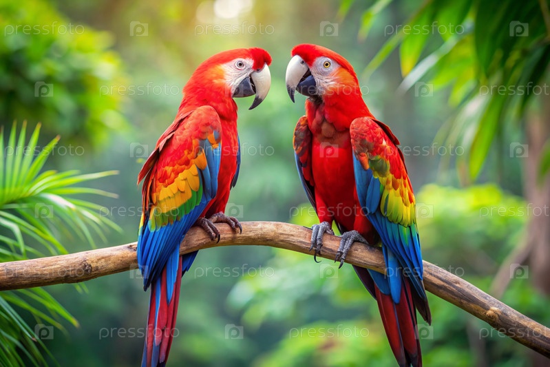 Два больших красных макак сидят на ветке на размытом тропическом фоне