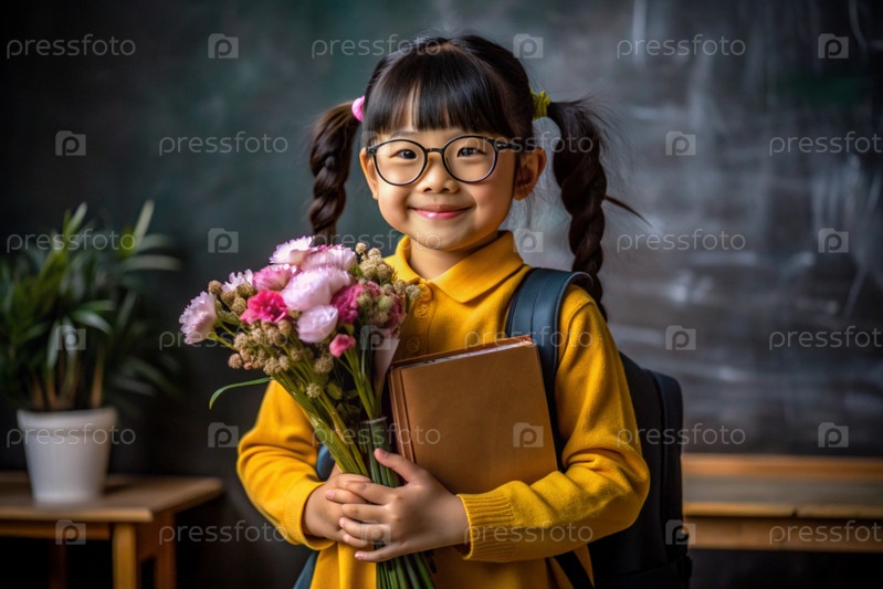 Первоклассный азиат с очками на доске. Девушка держит цветы в руках. Ребенок пойдет в школу впервые. Ребёнок с рюкзаком, книгой и цветами. Возвращение к школе
