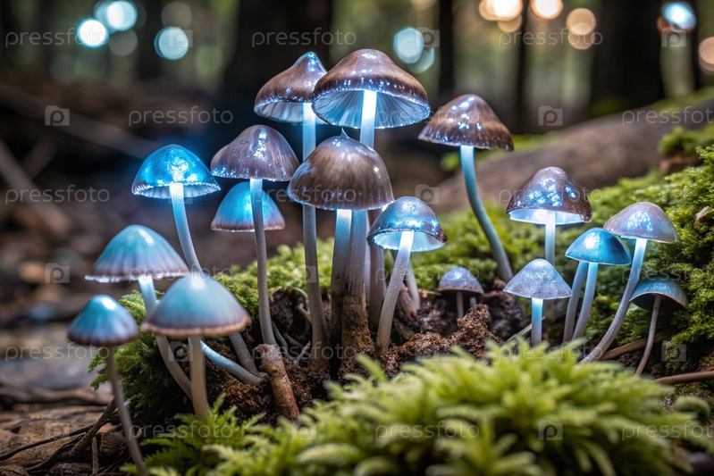 Ядовитые грибы. Жабы. Галлюциногенные грибы. Светящиеся грибы. Изображение для иллюстрации тем, связанных с природой, фантазией, сказками и магией