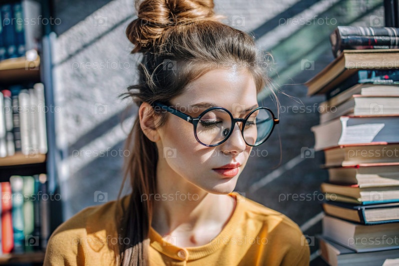 Чтение, подготовка к экзаменам. Прием в колледж. Молодая девушка с очками среди многих книг во внутренней части гостиной, сидящая дома под естественным светом