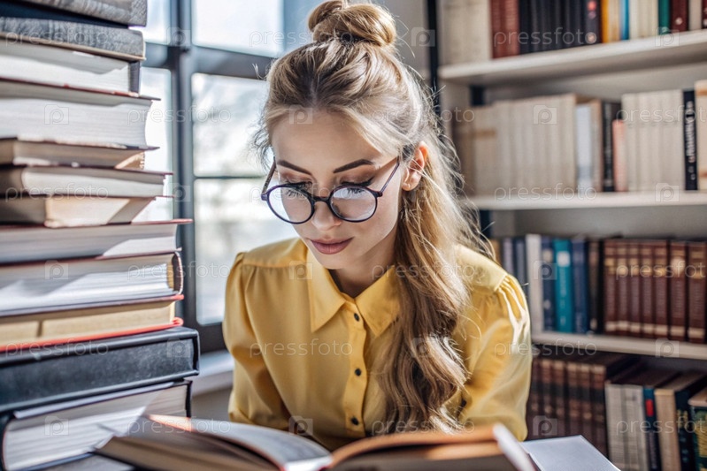 Чтение, подготовка к экзаменам. Прием в колледж. Молодая девушка с очками среди многих книг во внутренней части гостиной, сидящая дома под естественным светом