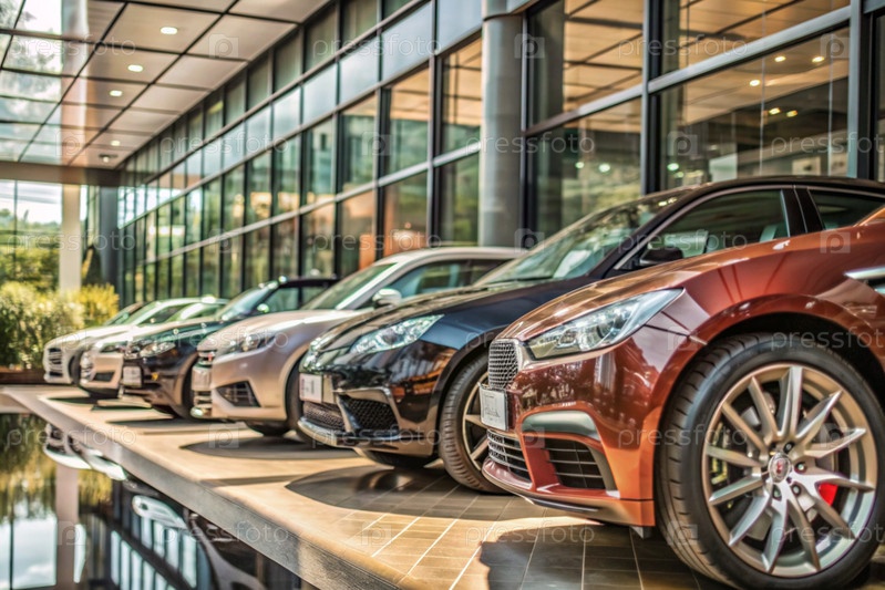 Офис современного автосалона. Бизнес-концепция продаж и аренды автомобилей. Новый автомобиль припаркован в современном автосалоне. Концепция автолизинга и страхования. Электрическое транспортное средство