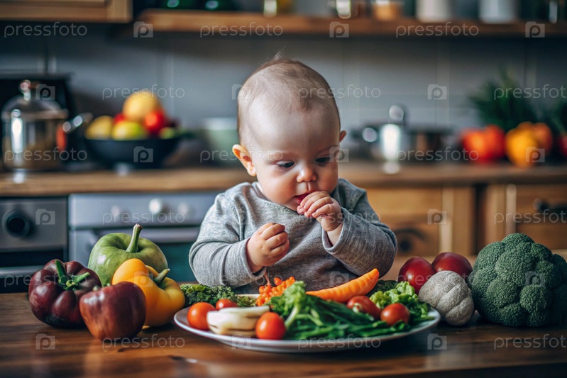 Здоровое детское питание. Первая еда. Кормить ребенка. Милый ребенок ест свежие овощи