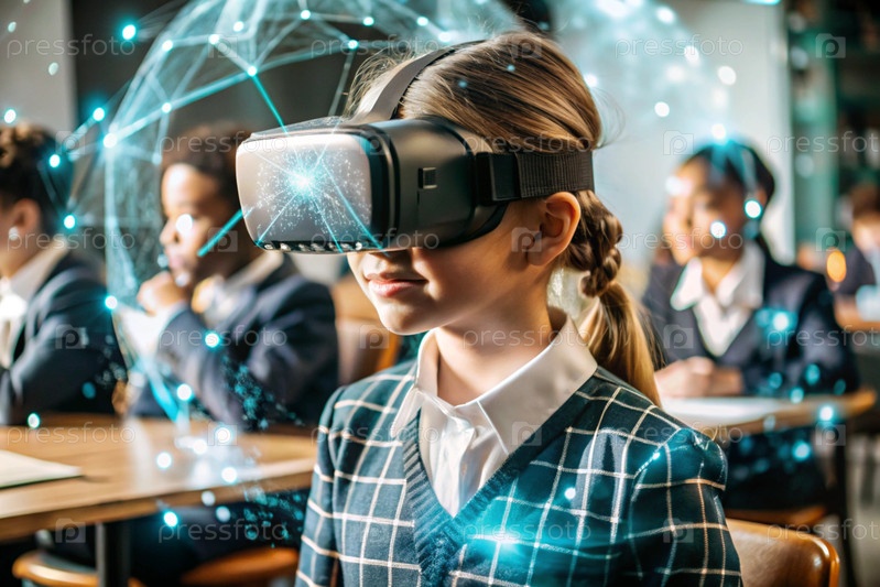 Девочка с очками виртуальной реальности. Ребенок находится в классе, а другие ученики на заднем плане. Цифровой интерфейс отображается в наушниках