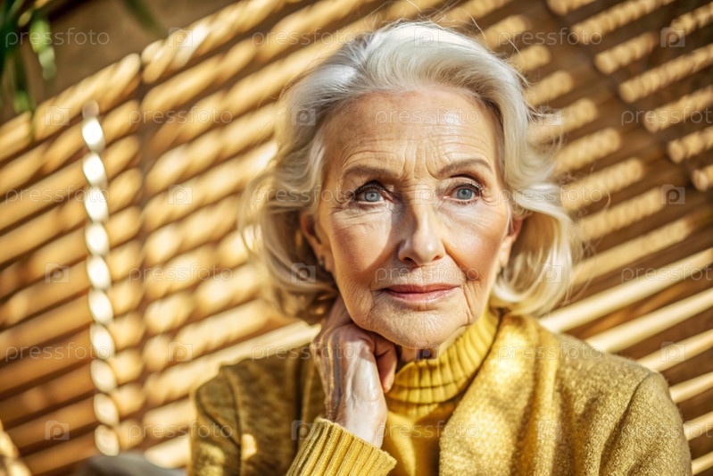 Минимализм.Студийный портрет стильной, элегантной пожилой женщины, 70-летнего пенсионера в интерьере и одежде спокойных тонов.Концепция пожилых людей