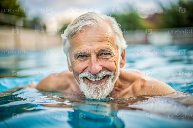 Пожилой мужчина плавает и занимается водной аэробикой в отопительном бассейне, счастливый и улыбающийся пенсионер
