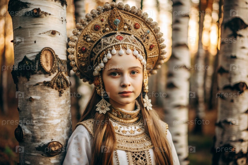 Красивая девушка в традиционном русском национальном костюме.Перед березовым ростом.Портрет символизирует традиции и красоту русского народа
