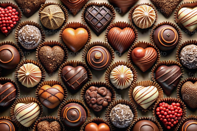 Ассортимент изысканного шоколада, белого, темного и молочного. История сладостей. Концепция Дня святого Валентина