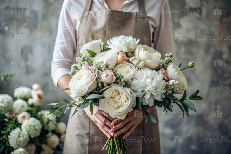 Малый бизнес. Декоратор цветочной лавки держит для покупателя красивый деликатный букет пионьев. Цветочный дизайн. Доставка цветов, обработка заказов