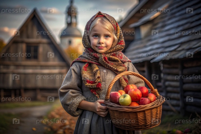 Красивая девушка в русской национальной одежде с корзиной спелых красных яблок на фоне православного храма
