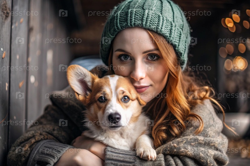 Женщина обнимает валлийскую собаку Корги в осеннем парке.Сознательная жизнь с домашним животным, концепция дружбы и любви к животным